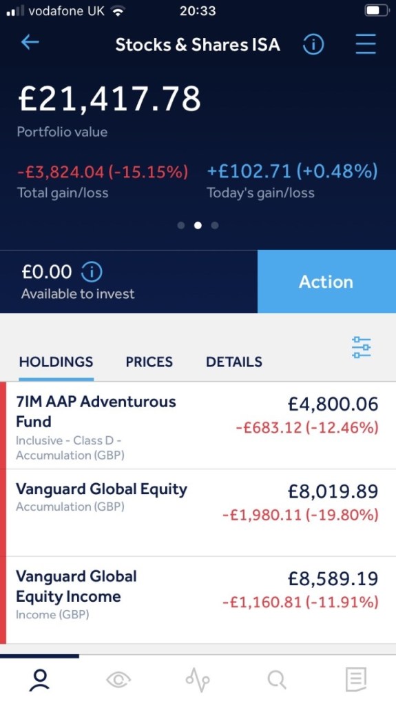When I pressed that deal button I never imagined the market to plummet the way it has but I made a sacrifice to myself and I’m going to stick to the plan. I knew when I was investing in a 100% equity; it was a risky portfolio which can go up and down but I know in the long term where my portfolio will go. I made a calculated decision to put that money away for my long term future. I don’t need to touch it hopefully for decades.